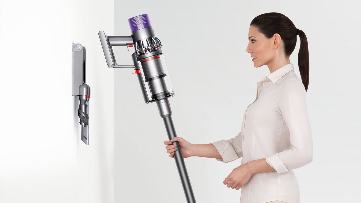 La aspiradora Dyson Cyclone V10™ se queda en la base fijada a la pared para recargar y tener los accesorios ordenados. Siempre está lista para limpiar.